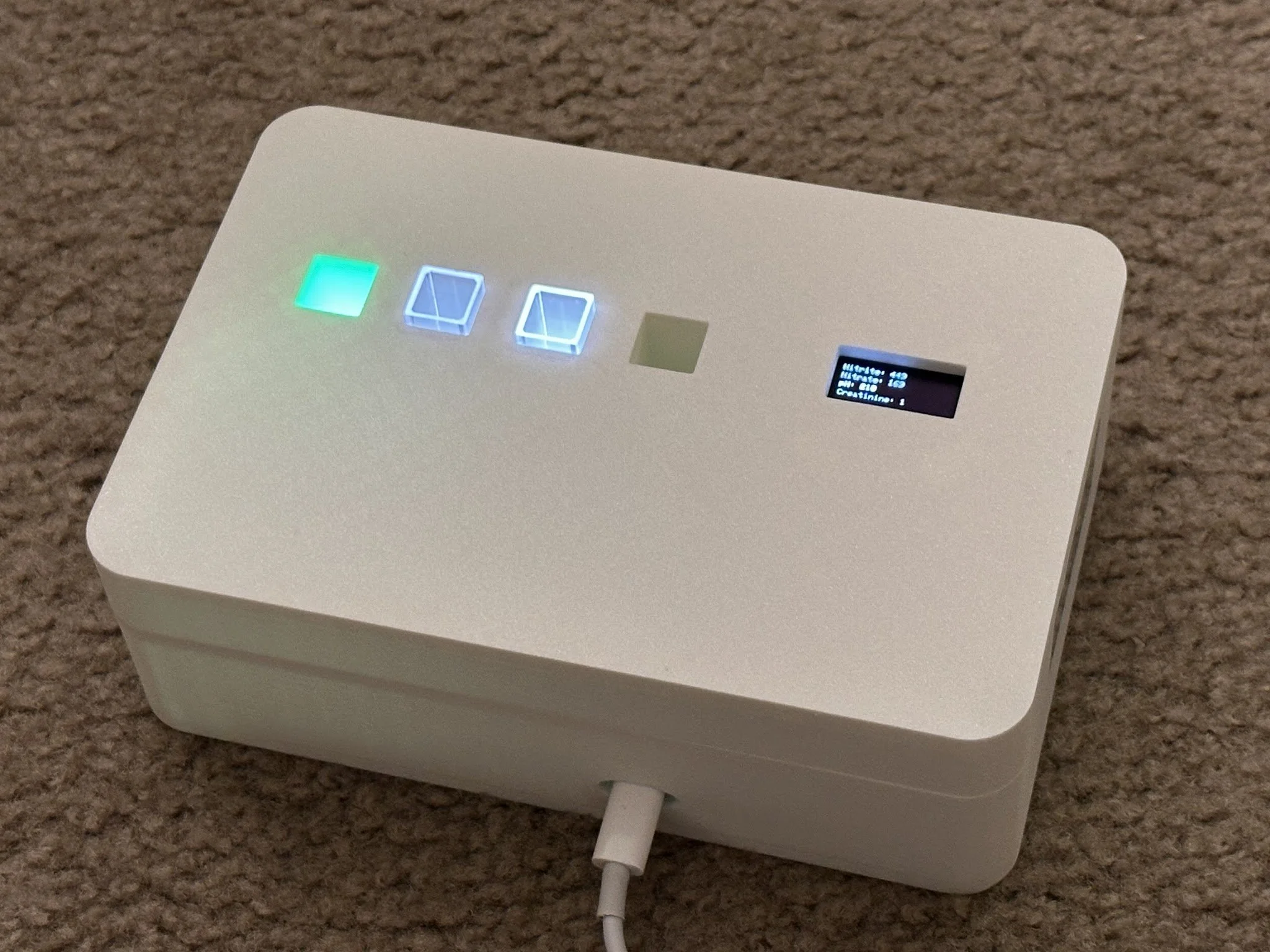 A portable point-of-care urinalysis device that performs spectral analysis of reagent-treated urine samples to quantify biomarkers including pH, nitrite, nitrate, and creatinine. The system captures wavelength-specific reflectance data and converts it into calibrated concentration estimates within a compact, battery-powered enclosure.